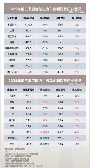 在盈利情况层面,受美国关税政策冲击及中国市场销量下滑影响,海外车企的净利润出现普遍性下滑,其中奔驰、大众、本田利润降幅超50%,全球利润最高的丰田降幅也达16%。反观国内头部车企,比亚迪、奇瑞前三季度净利润均突破百亿元,展现出更强的盈利韧性。